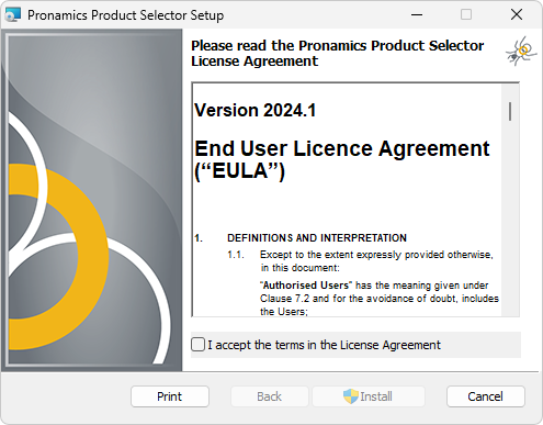 Pronamics Product Selector - EULA - After you have thoroughly read the Terms and Conditions listed in the dialogue, and you agree to these terms, check the box that states I agree to the licence terms and conditions. You may now click the Install button to begin the installation of the Pronamics Product Selector.