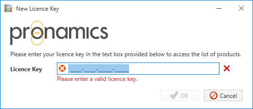 Upon first opening the Pronamics Product Selector, you are prompted to enter a licence key. In doing so, you will be provided with a list of Pronamics Products registered to the licence key which can be installed on your machine.
