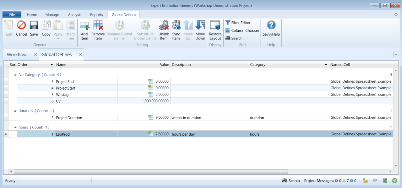 The Global Defines window allows you to create and customise variables which you can refer to in formula throughout the project.