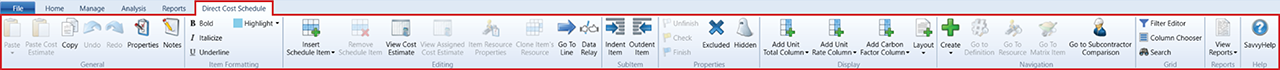 Direct Cost Schedule – ribbon toolbar (Refer to the following image popups for more detail.)