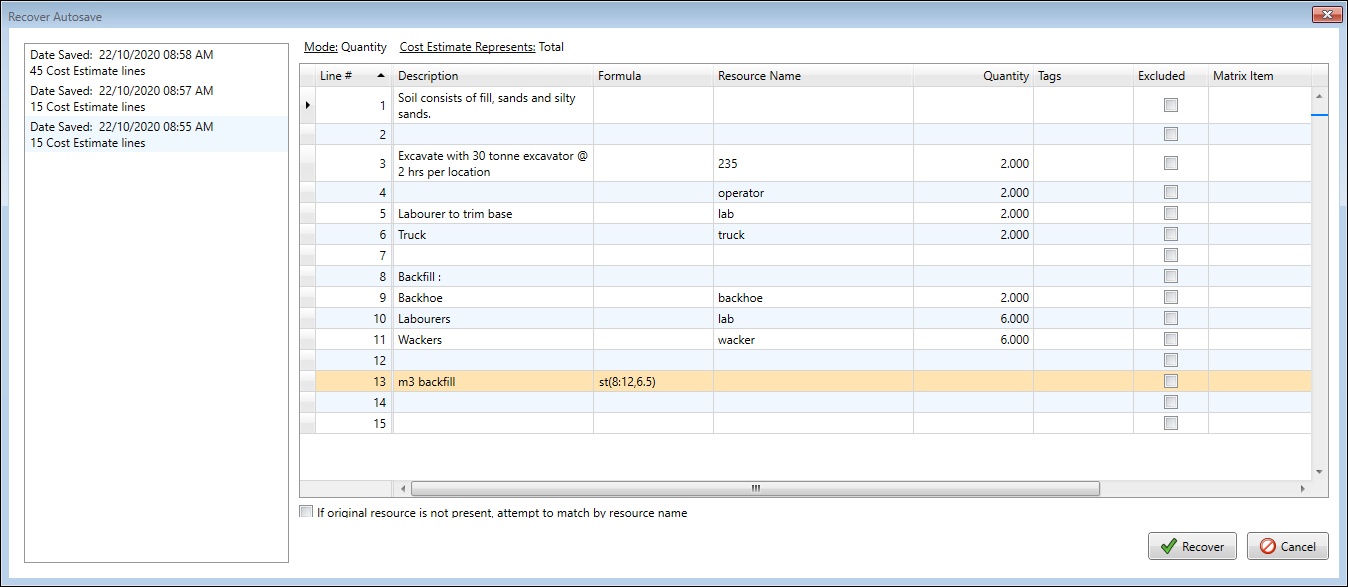 Note: If any resources have been removed/replaced, Checking the tick box option labelled “If original resource is not present, attempt to match by resource name” will attempt to optimistically match a Resource in the selected Autosave data based on name. If there is a match found it will use that Resource, otherwise it will indicate a missing Resource on the restored Cost Estimate.