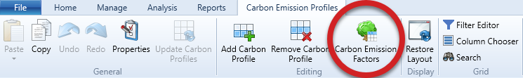 From the Carbon Emission Profiles window users can define a set of Carbon Emission Factors. Carbon Emission Factors can be accessed via the Carbon Emission Factors button on the Carbon Emission Profiles ribbon toolbar. Factors can be grouped for easier organisation.