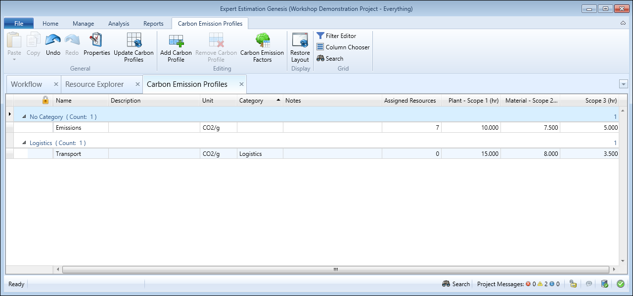 Carbon Emission Profiles are the source of emissions data for a project. Each Profile contains a column for every defined Carbon Emission Factor, and these columns are populated with the quantity of emissions generated for that Profile.
