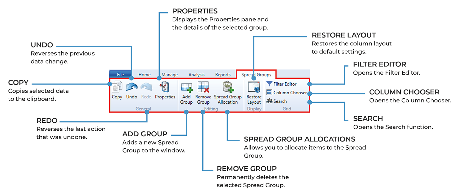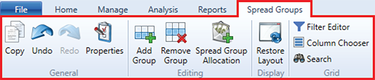 The contextual ribbon toolbar for the Spread Groups window provides you with access to all of the functions that allow you to add, remove and modify the Spread Groups within your project.