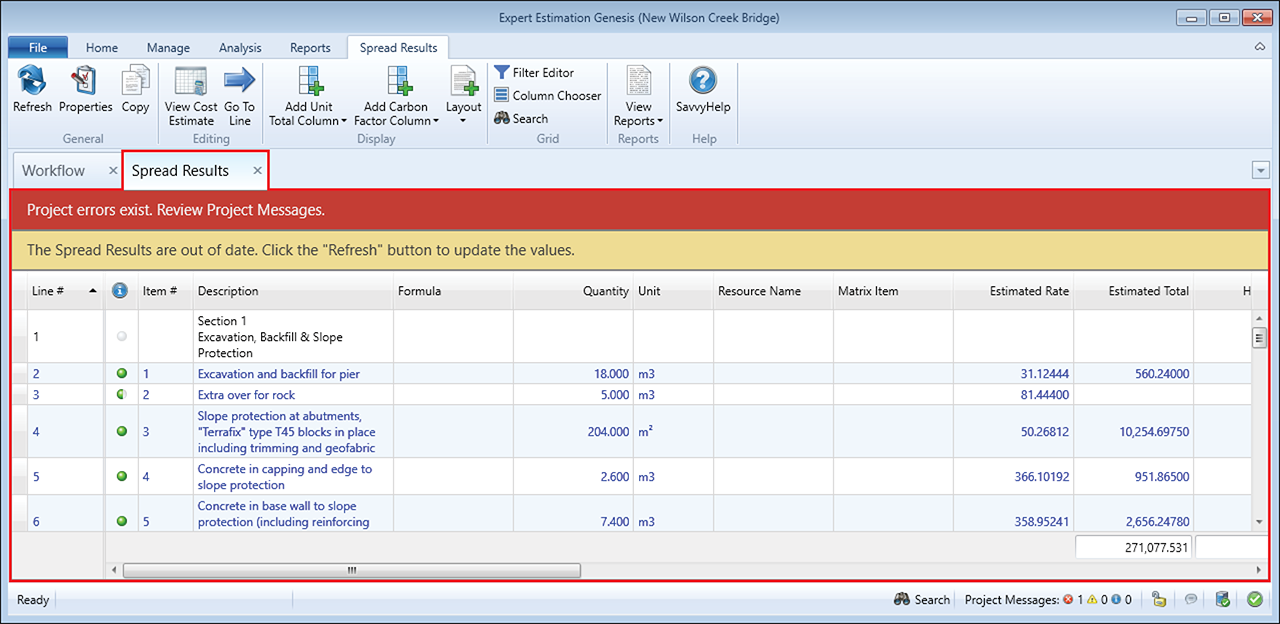 Note: All project error messages must be resolved before a spread can be calculated.